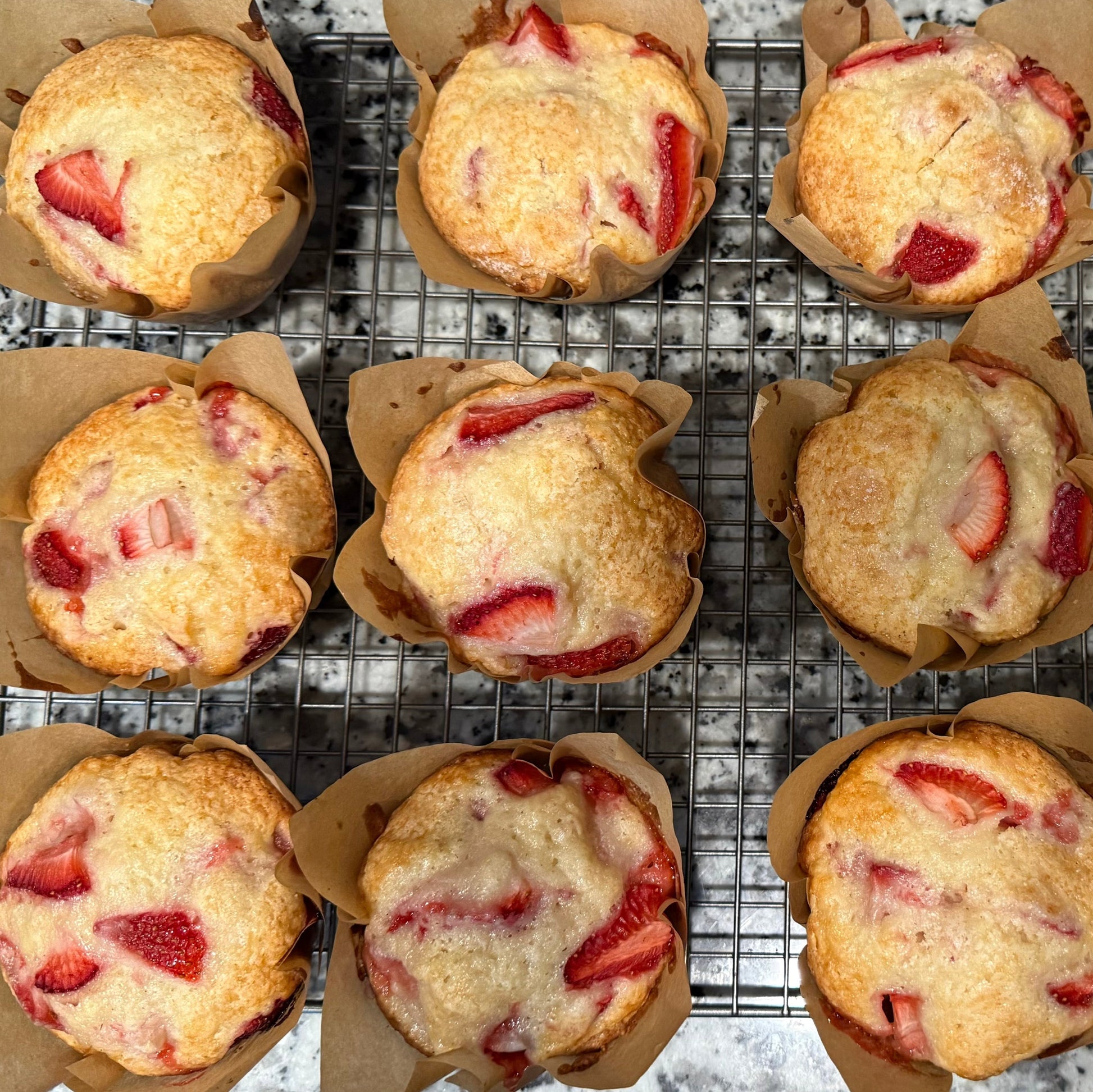 Fresh Strawberries baked in a perfectly sweet and fluffy muffin. Perfect for breakfast or dessert :)